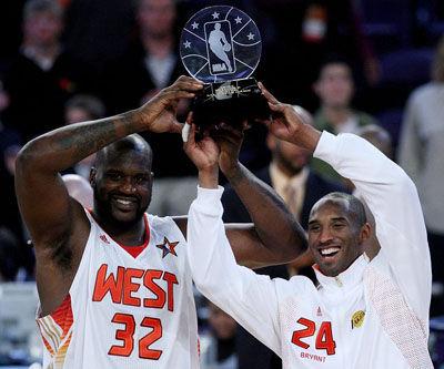 掀翻赛场的大鲨鱼,他和科比一样拥有12座奖杯,这也是兄弟的缘分啊。他的12座NBA奖杯组成是,4个总冠军,3个FMVP,3个AMVP,一个MVP的,还有一个最佳新秀(ROY)。科比和奥尼尔在2009年的全明星上面两人共同捧起AMVP奖杯的身影,至今难忘。