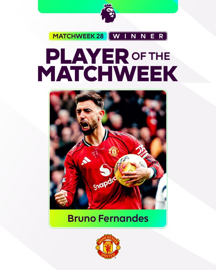 英超官方宣布,经过球迷的投票,B费当选本轮英超最佳球员,本赛季第四次获得这一奖项。